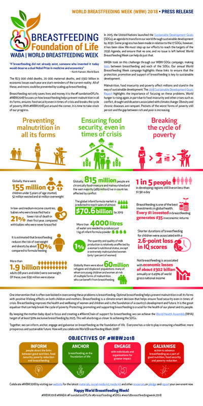 - Communiqué de presse de WABA à l'occasion de la Semaine mondiale de l'allaitement maternel 2018 : (i) prévenir la malnutrition sous toutes ses formes, (ii) assurer la sécurité alimentaire, même en temps de crise, (iii) briser le cycle de la pauvreté. | A press release from WABA for the World Breastfeeding Week 2018 : (i) Prevention malnutrition in all its forms, (ii) Ensuring food security, even in time of crisis, (iii) Breackin the cycle of poverty
