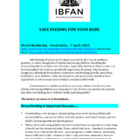 - Communiqué dans le cadre de la Journée mondiale de la Santé du 7 avril 2015 ayant comme thème la sécurité sanitaire des aliments, organisée par l'Organisation mondiale de la Santé. Inclut les risques du non-allaitement et ceux liés aux préparations commerciales pour nourrisons.