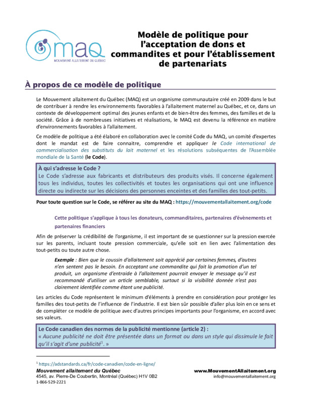 - Ce modèle de politique vise à protéger les organisations du risque d'apparence de conflits d'intérêts avec l'industrie de l'alimentation des tout-petits, tout en leur permettant d'élargir leur recherche de financement. Il facilite le respect du Code international de commercialisation des substituts du lait maternel et des résolutions subséquentes de l'AMS.