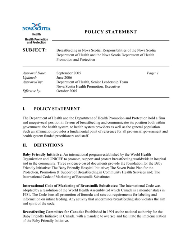 Policy Statement : Breastfeeding in Nova Scotia : Responsibilities of the Nova Scotia