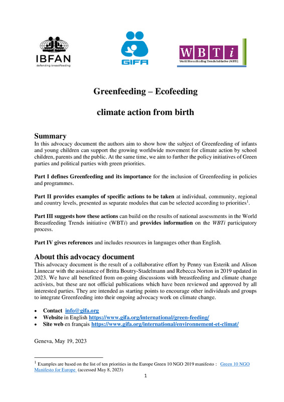 Greenfeeding – Ecofeeding : climate action from birthCe document de plaidoyer met en lumière le concept d’alimentation écologique des nourrissons et des jeunes enfants (« greenfeeding ») comme levier d’action dans la lutte contre les changements climatiques. Il souligne les liens entre les pratiques alimentaires durables en petite enfance et les mouvements mondiaux pour la justice climatique, en particulier ceux portés par les jeunes, les familles et le grand public. Le texte vise également à renforcer les politiques des partis politiques engagés en faveur de l’environnement.