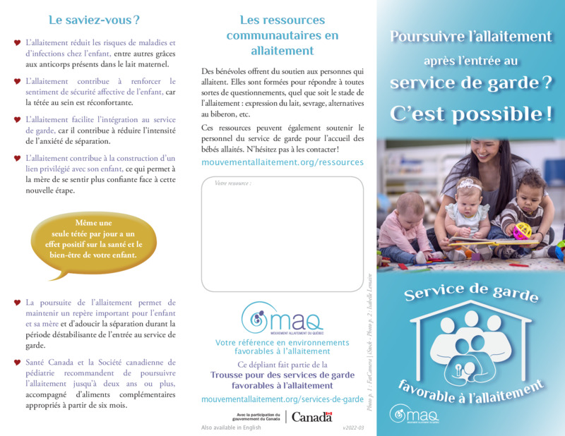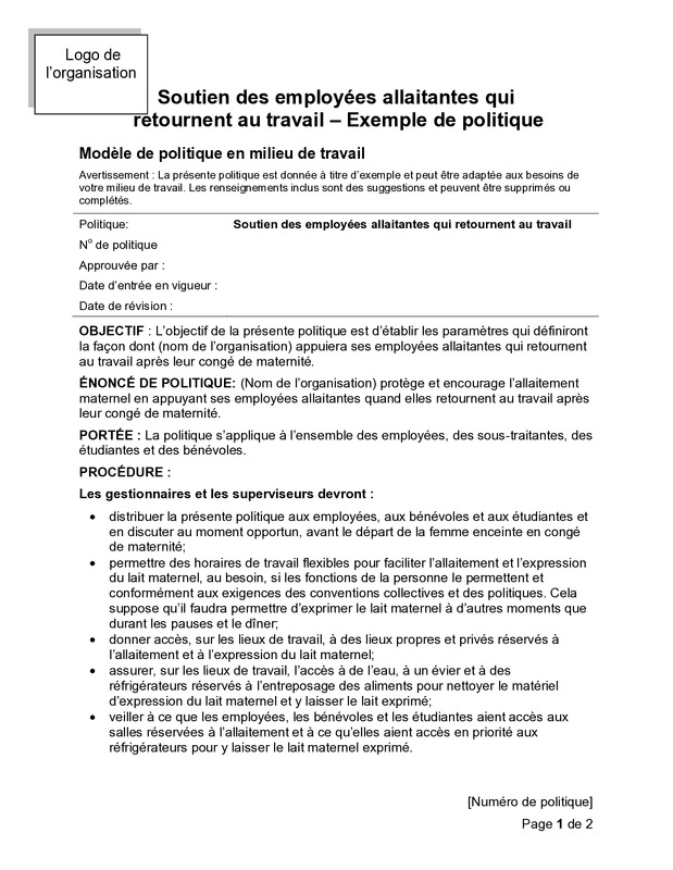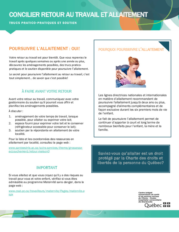 Vue d'ensemble | Le soutien à l'allaitement en milieu de travail : une dimension essentielle de la conciliation famille-travailLe document ''Le soutien à l’allaitement en milieu de travail : une dimension essentielle de la conciliation famille-travail'' met en lumière l'importance de soutenir l'allaitement en milieu de travail afin de favoriser la conciliation famille-travail. Il souligne que des environnements de travail favorables à l'allaitement, tels que des espaces dédiés et une flexibilité horaire, apportent des avantages considérables aux employeurs, notamment une plus grande satisfaction et rétention du personnel, ainsi qu'une réduction de l'absentéisme.